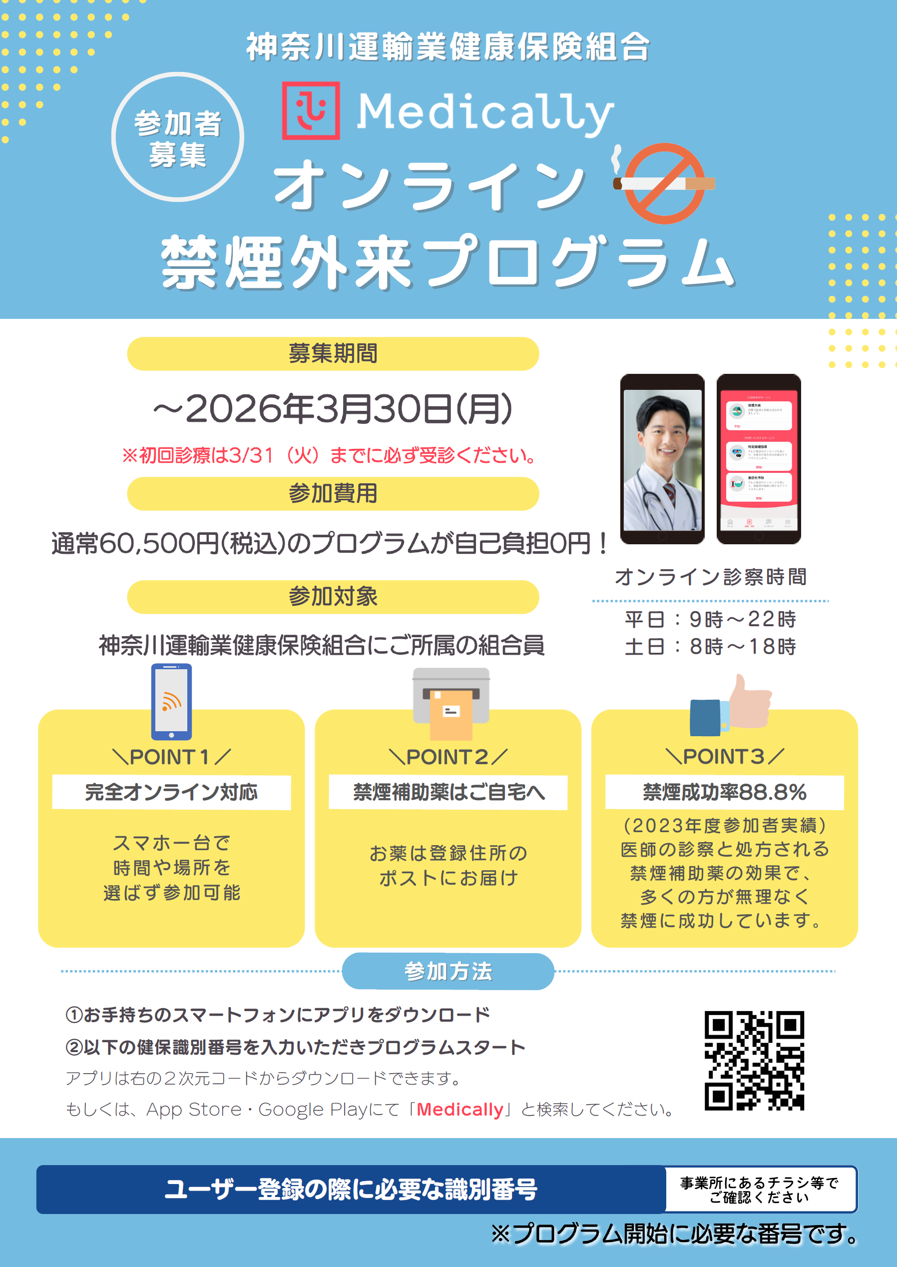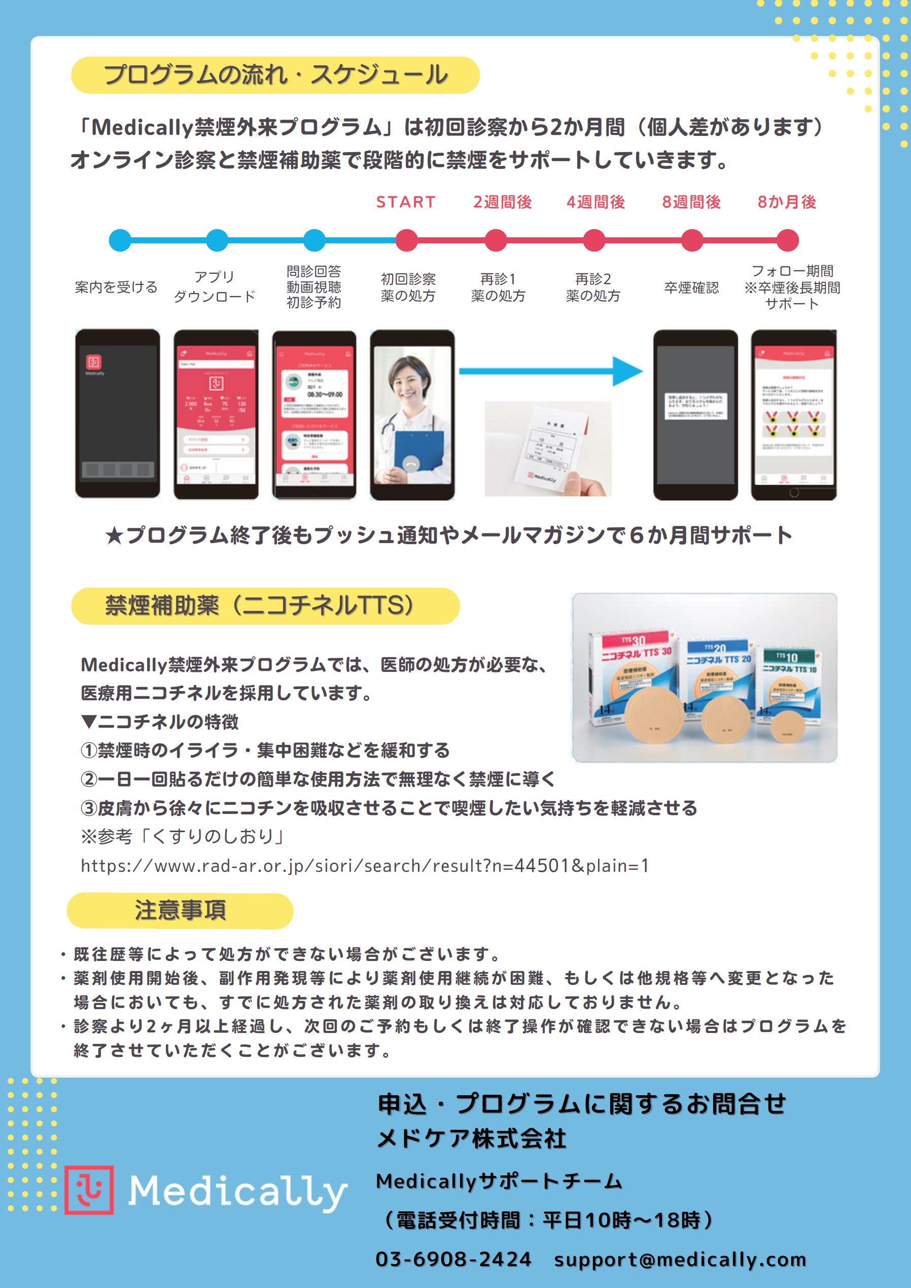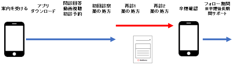 今年度は、Medically禁煙外来プログラムを実施します。初回診察から2か月間(個人差があります)オンライン診察と禁煙補助薬で段階的に禁煙をサポートしていきます。